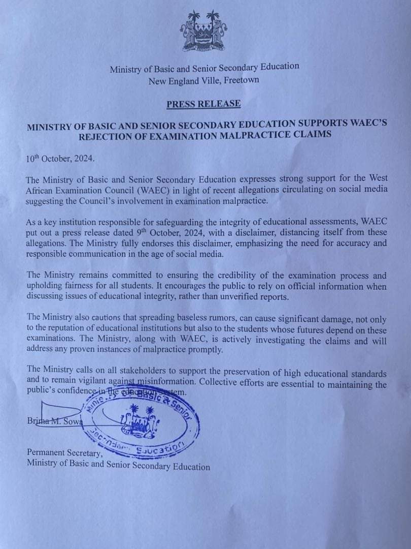 The Ministry of Basic and Senior Secondary Education in Sierra Leone has voiced its strong support for the West African Examination Council (WAEC) following recent allegations of examination malpractice circulating on social media.