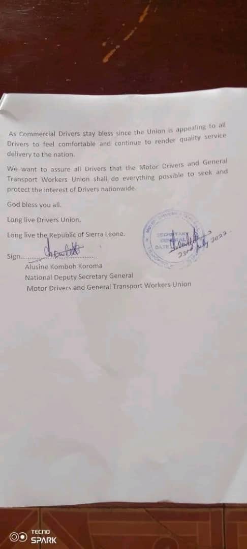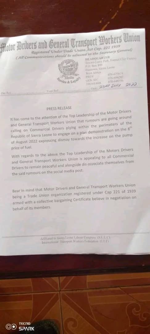 The leadership of the Motor Drivers and General Transport Workers Union has on a press release dated 23rd July, 2022 noted that it has learnt of rumors calling on drivers to engage on plan demonstration on the 8th August,2022, to express dismay on the pump price of fuel.