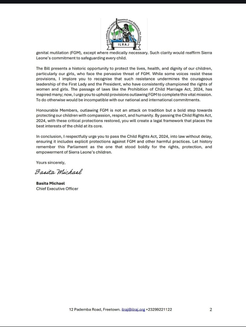 Michael warned that passing the Child Rights Act without a direct ban on FGM would go against Sierra Leone’s promises under both international and African agreements. She said the new law is a chance to protect children and show strong national leadership.