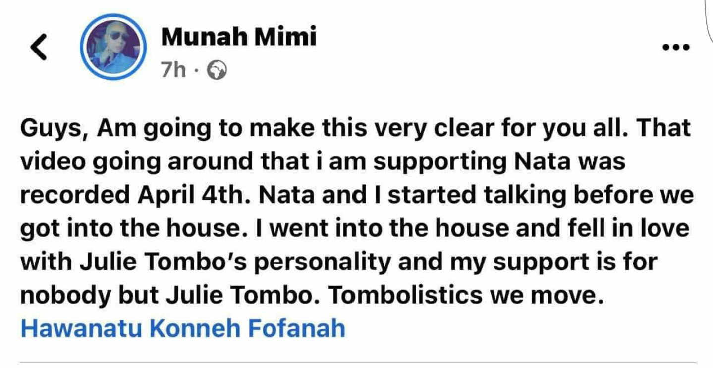 Munah claims that the video making rounds on social media was recorded on the 4th of April 2022 before they entered the housemate Salone’s house, adding that she and Nata were talking before they get into the house, but after she got into the house she then falls in love with Juliana Conteh’s aka Julie Tombo personality and declared that her support is for nobody but Julie Tombo