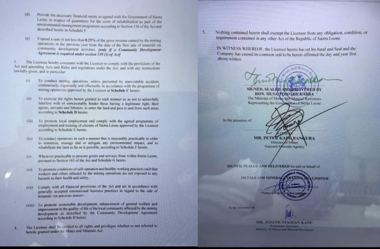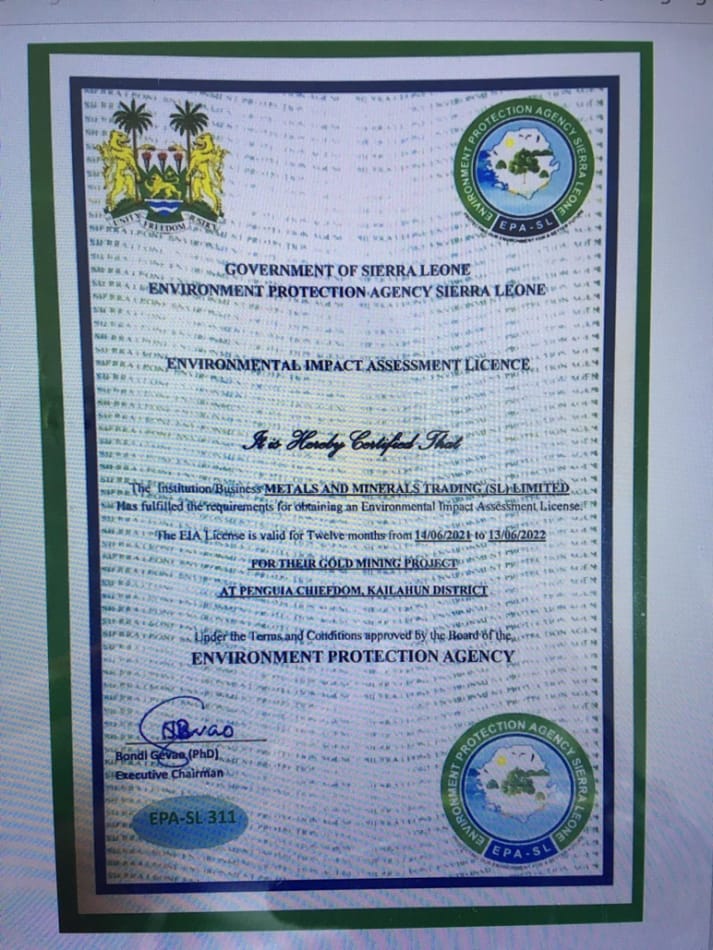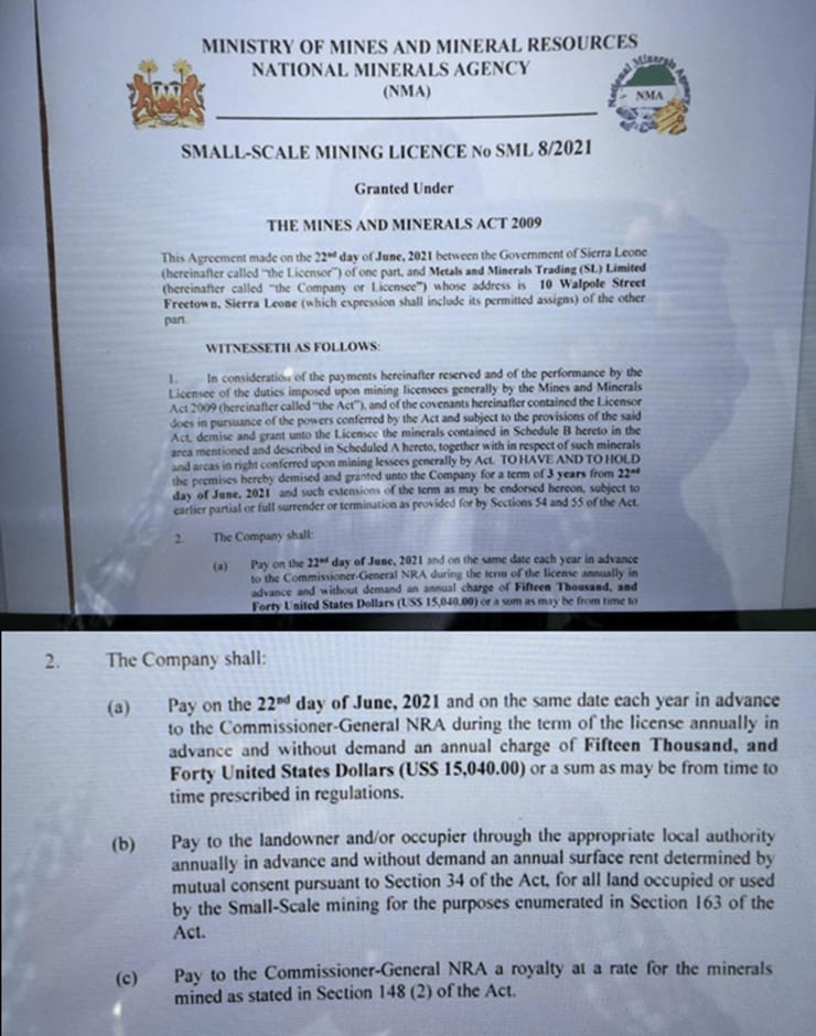 The second license, titled Small-Scale Mining License No SML 8/2021, was granted on 22nd June 2021, two days after the investigative article was published. The minister of mines and mineral resources secretly granted these operating licenses without due process to Metals and Minerals Trading (SL) Limited to mine gold in Penguia Chiefdom.