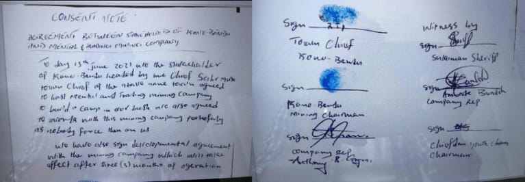 A single page ‘agreement’ called ‘Consent Note’ shows signatures of two chiefs (in thumbprints) and signatures of company-associated people acting as representatives and witnesses (Photo above).