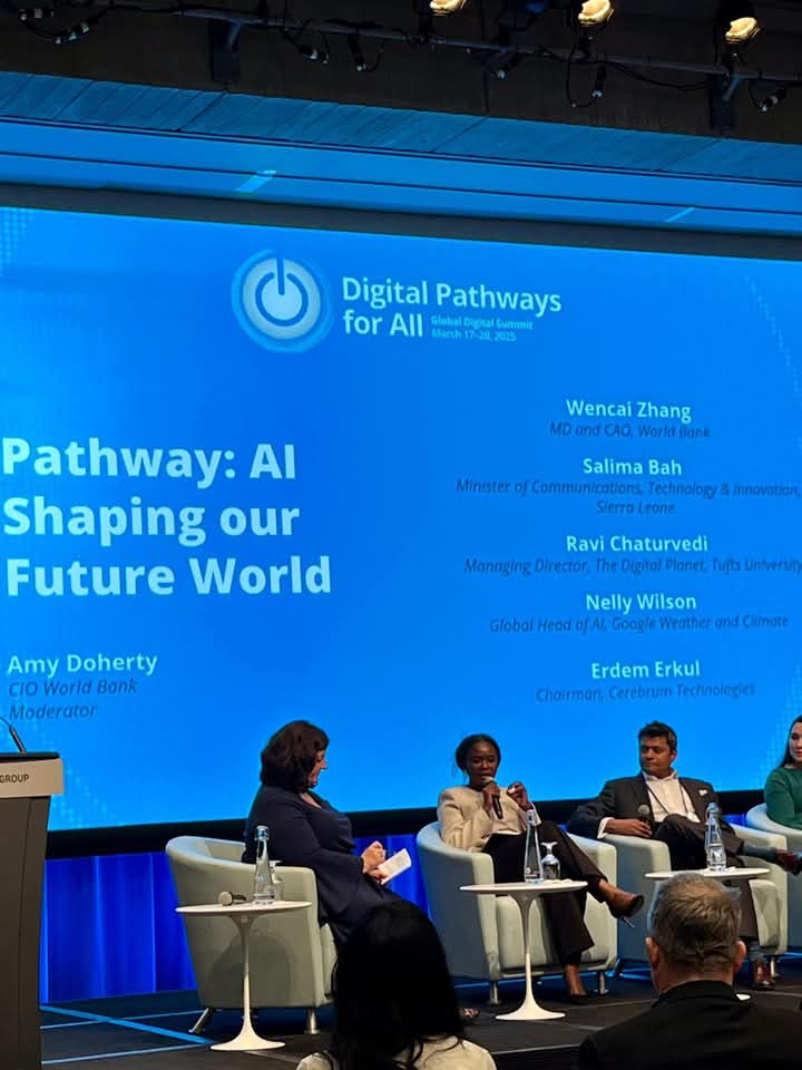 At the World Bank Digital Summit 2025, Sierra Leone’s Minister of Communication, Technology, and Innovation, Salima Monorma Bah, participated in a panel discussion titled “AI Shaping Our Future World,” where she highlighted Sierra Leone’s efforts to integrate artificial intelligence into its national development strategy.