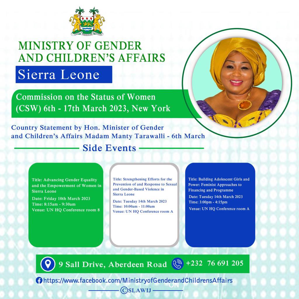 Sierra Leone’s Minister of Gender and Children’s Affairs, Manty Tarawalli is set to lead a delegation that will take part in the 67th Commission on the Status of Women (CSW) in New York.