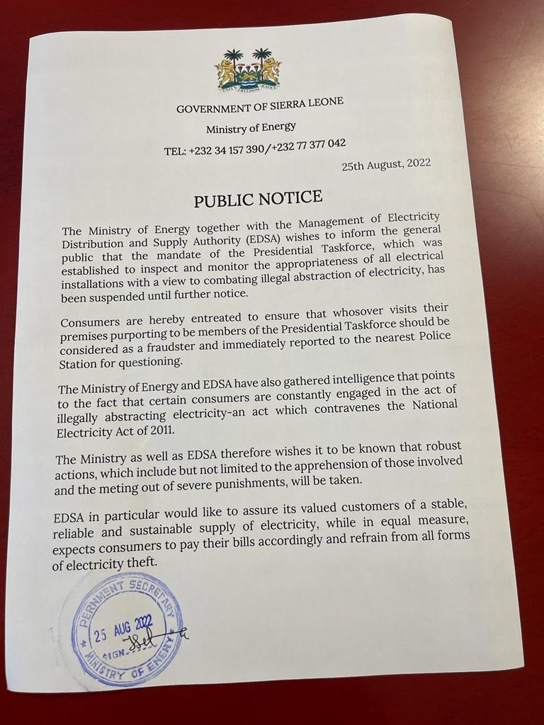 The Ministry of Energy together with the Management of Electricity Distribution and Supply Authority (EDSA) has informed the general public that the mandate of the Presidential Taskforce, which was established to inspect and monitor the appropriateness of all electrical installations with a view to combating illegal abstraction of electricity, has been suspended until further notice.