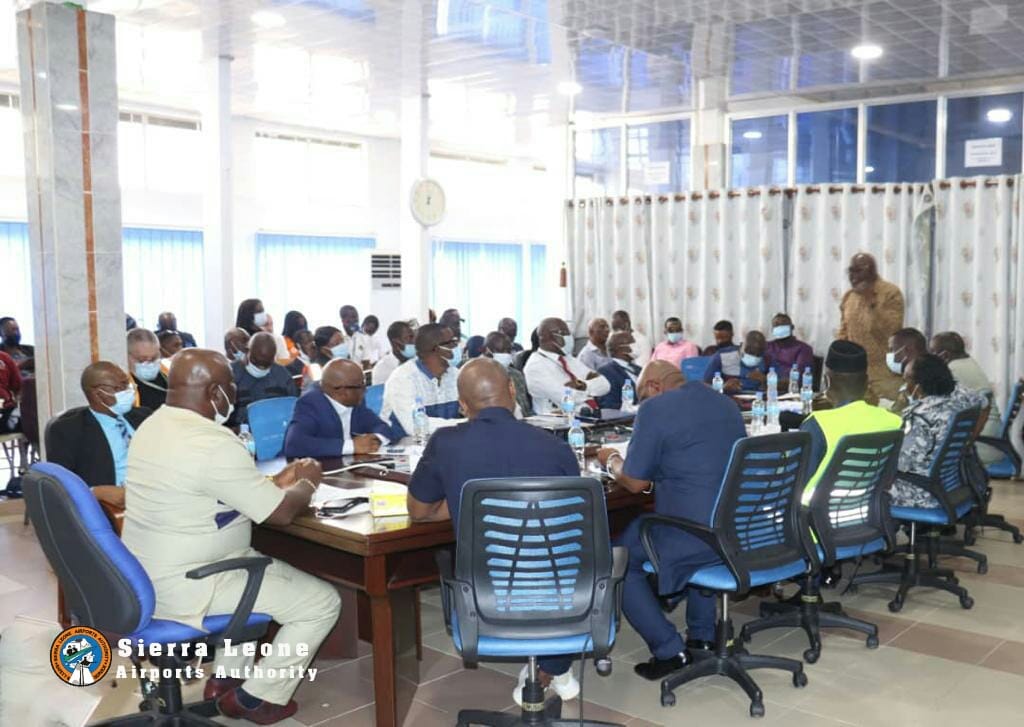 After several consultations on providing a conducive system for passengers using the Freetown international Airport during this peak period and beyond , the Minister of Transport and Aviation Mr Kabineh Kallon has held a one day working session on the 9th of December 2021 to put the joint strategies and detailed plan for immediate action at the Freetown International Airport. The meeting also gave him the opportunity to speak to the airport Management and different Agencies on strict adherence to sound aviation best practices and put measures to address Government and passenger concerns on four strategic areas; Security and Access Control, NACOVERC procedures, integrity of staff and customs revenue generation.