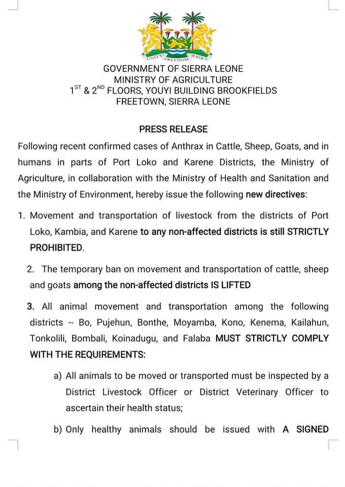 Following recent confirmed cases of Anthrax in Cattle, Sheep, Goats, and humans in parts of Port Loko and Karene Districts, the Ministry of Agriculture, in collaboration with the Ministry of Health and Sanitation and the Ministry of Environment, hereby issue the following new directives: