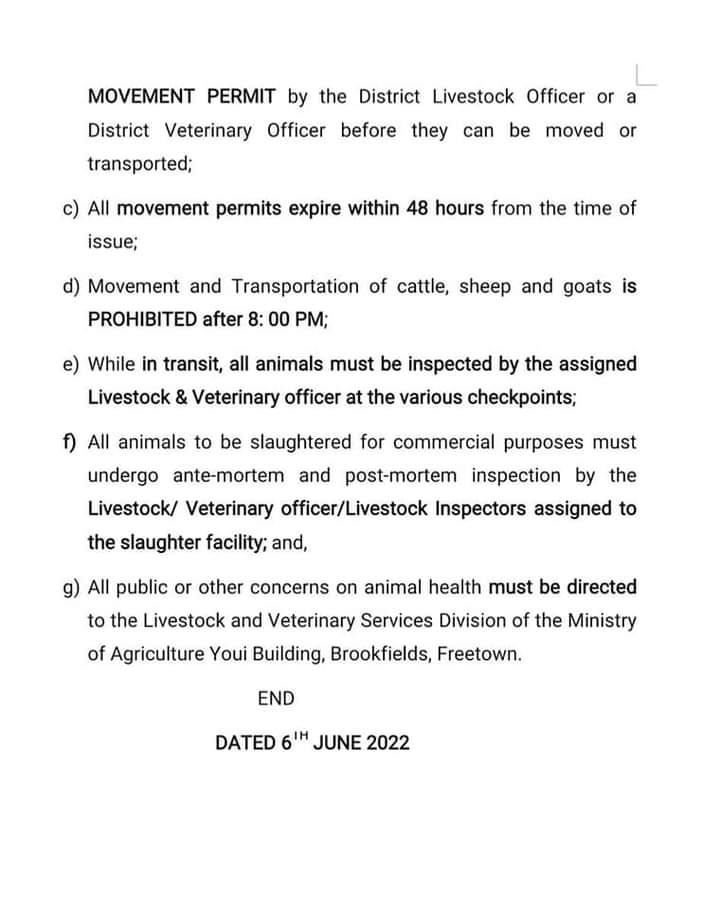 1. Movement and transportation of livestock from the districts of Port Loko, Kambia, and Karene to any non-affected districts are still STRICTLY PROHIBITED.