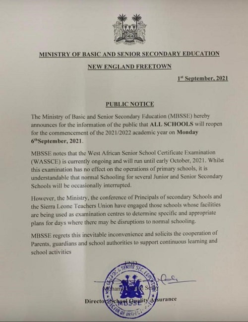 Sierra Leone’s Ministry of Basic and Senior Secondary School Education (MBSSE) has announced Monday September 6, 2021 as the resumption date for schools in Sierra Leone.