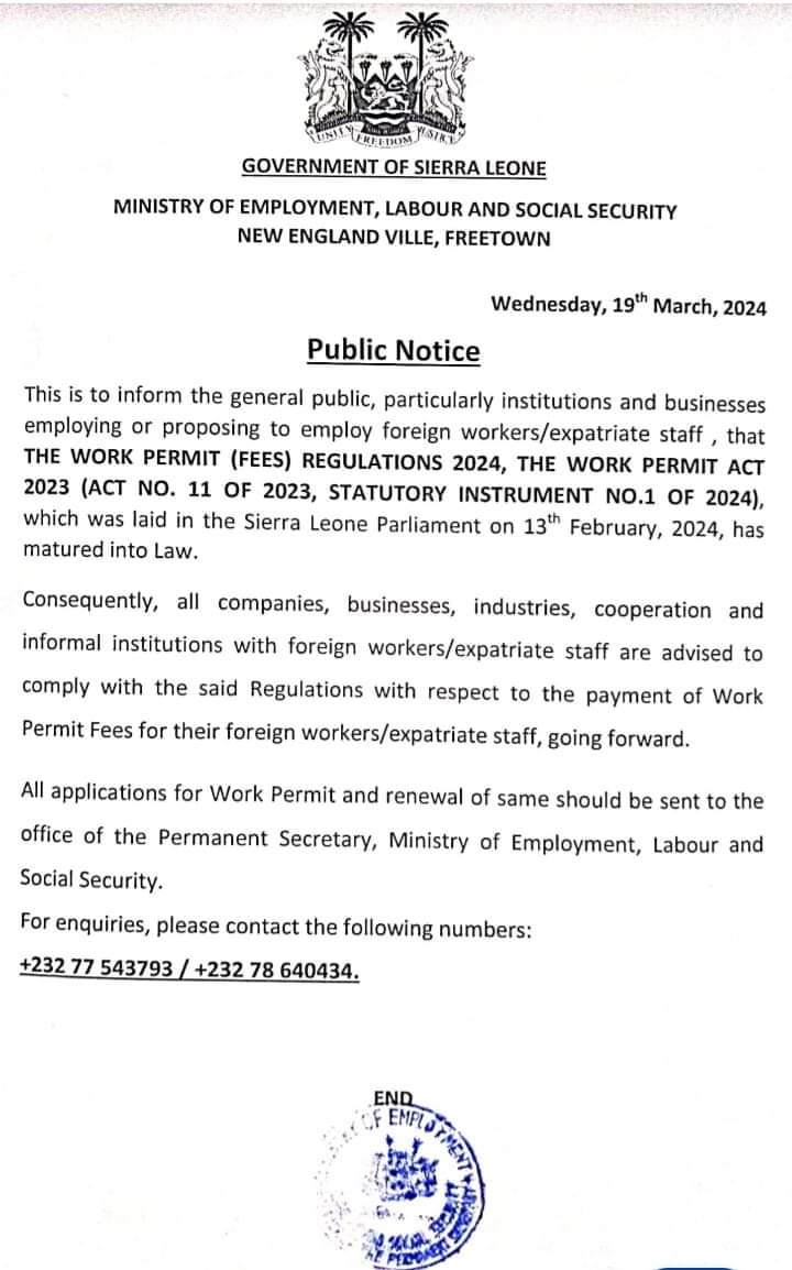 They called out on those that are employing or proposing to employ foreign workers/expatriate staff, that THE WORK PERMIT (FEES) REGULATIONS 2024, THE WORK PERMIT ACT 2023 (ACT NO. 11 OF 2023, STATUTORY INSTRUMENT NO.1 OF 2024), which was laid in the Sierra Leone Parliament on 13th February, 2024, has matured into Law.