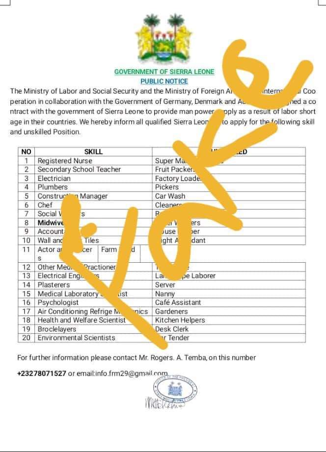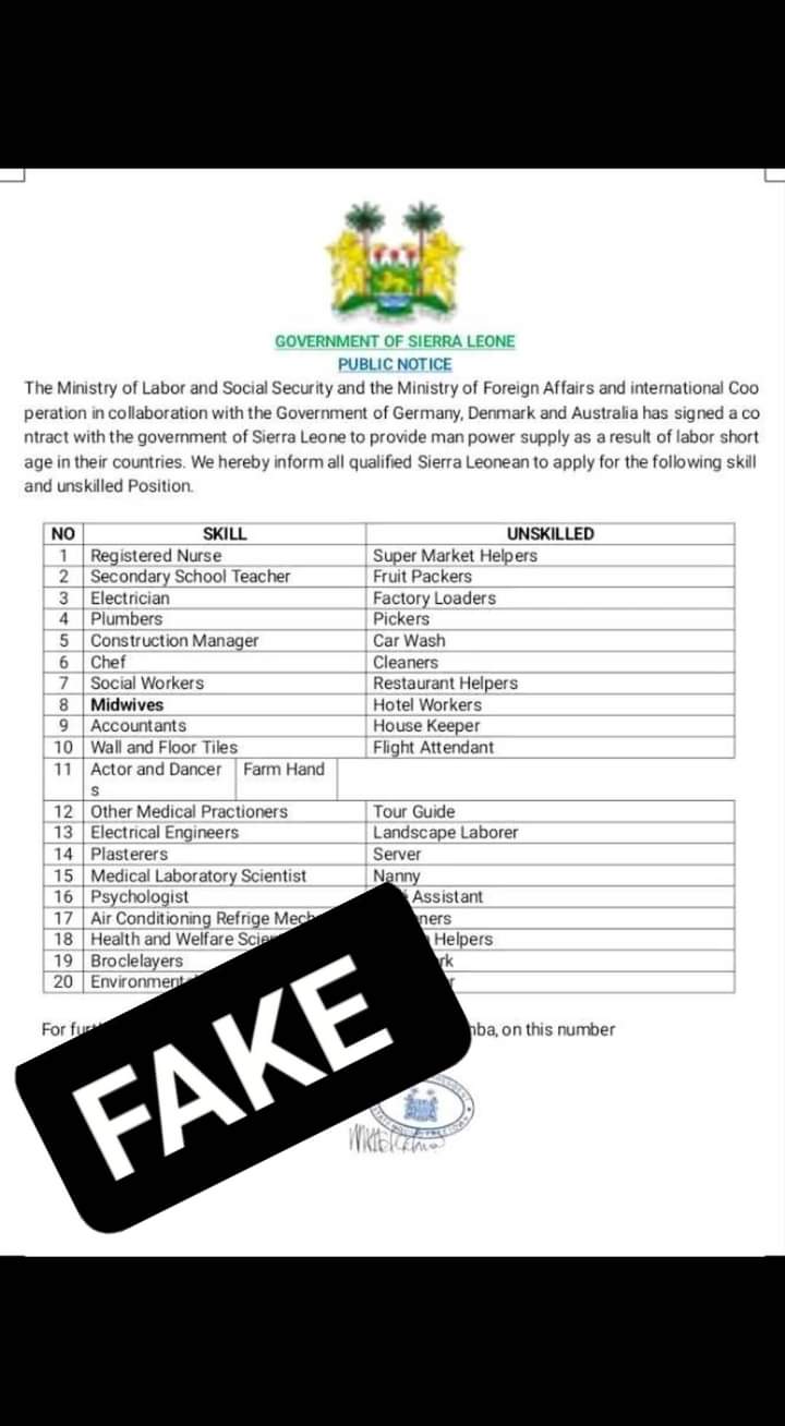 Sierra Leone’s Ministry of Employment, Labour and Social Security has called on the public to disregard a trending notice on social media entreating prospective job seekers to apply to the Ministry.
