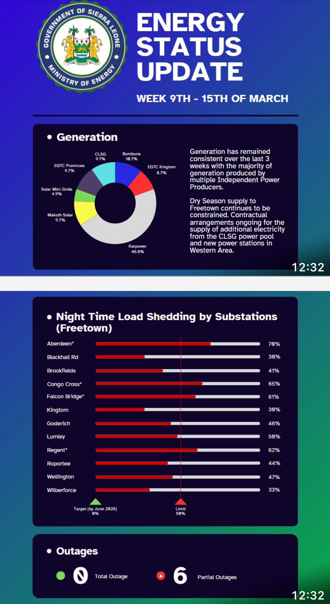 Sierra Leone’s Ministry of Energy has released its weekly energy status update for the period of March 9th to 15th, revealing consistent power generation alongside ongoing efforts to address load-shedding challenges in Freetown.