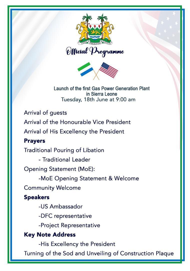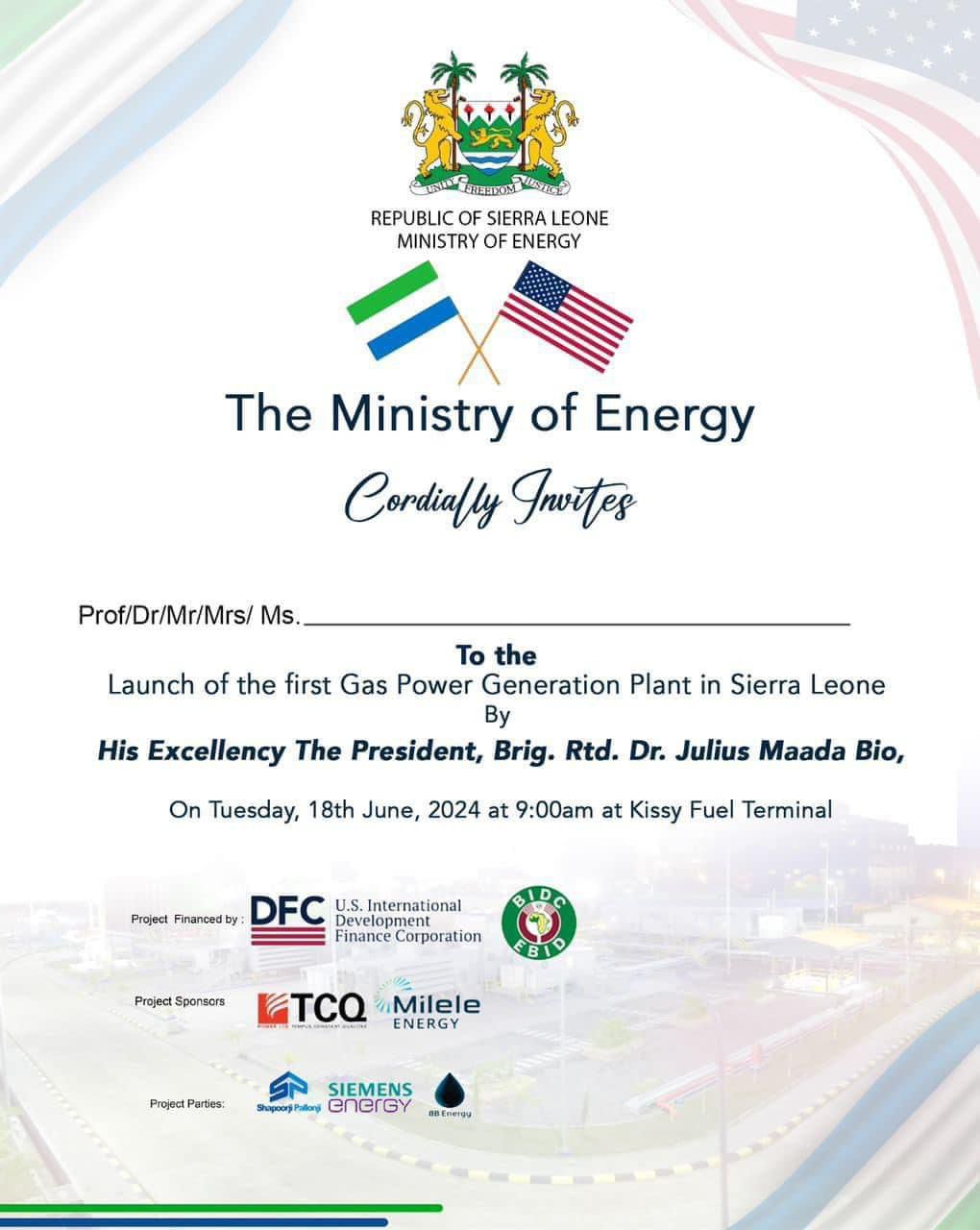 The Ministry of Energy has announced date for the launch of the First Gas Power Generation Plant in Sierra Leone by His Excellency President Julius Maada Bio.