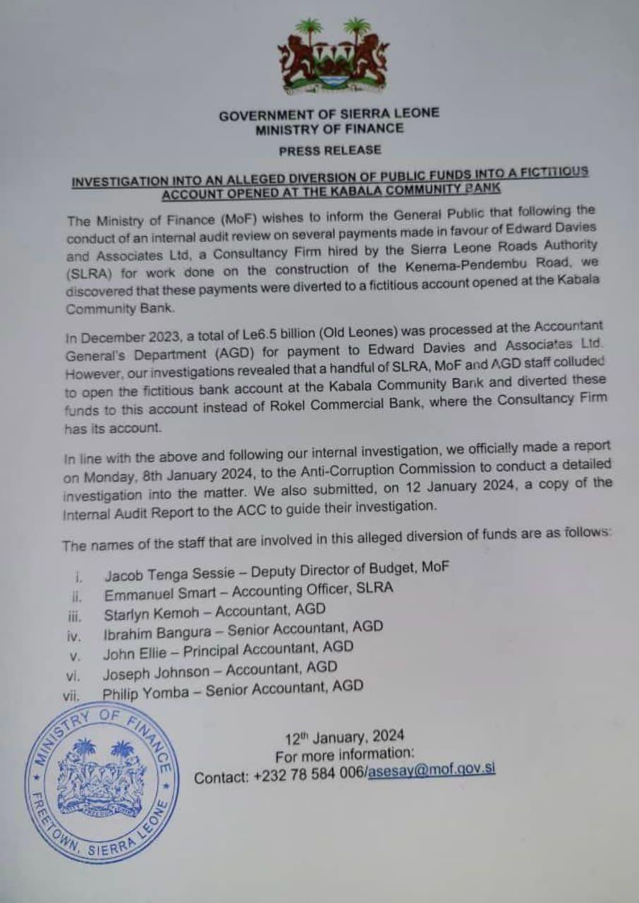 The Ministry of Finance has on the 12th January 2024 confirmed that some staff at the Ministry have been involved into an alleged diversion of public Funds into a fictitious account opened at the Kabala Community Bank.