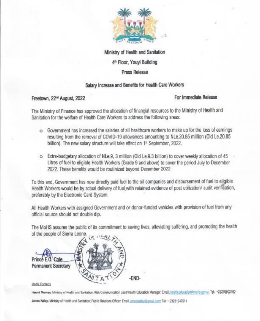 Sierra Leone’s Ministry of Health and Sanitation has today, Monday 22 August 2022 announced the salary increases and benefits of health care workers in the country.