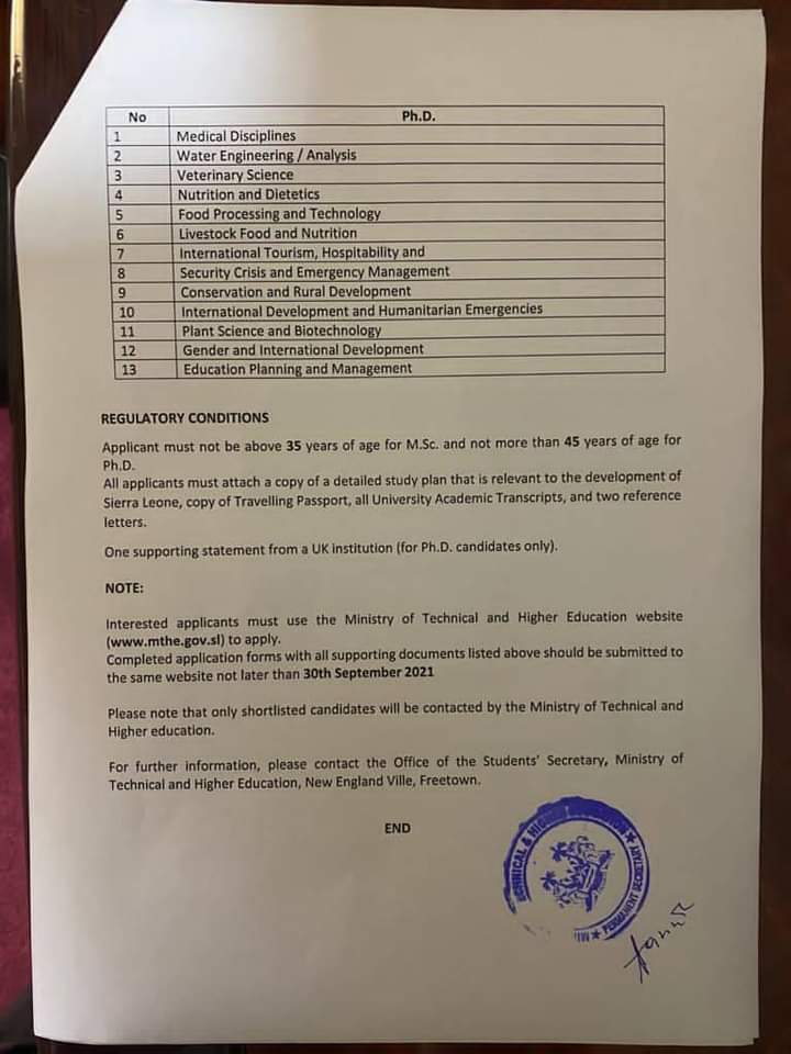 Applicants are expected to do their application online via the Ministry’s website (www. mthe.gov.sl).