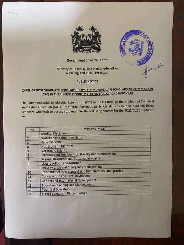 The Ministry of Technical and Higher Education has called on people who wish to pursue post-graduate studies to apply for the Commonwealth Scholarship Commission (CSC) post-graduate scholarship for the 2021-2022 academic year.