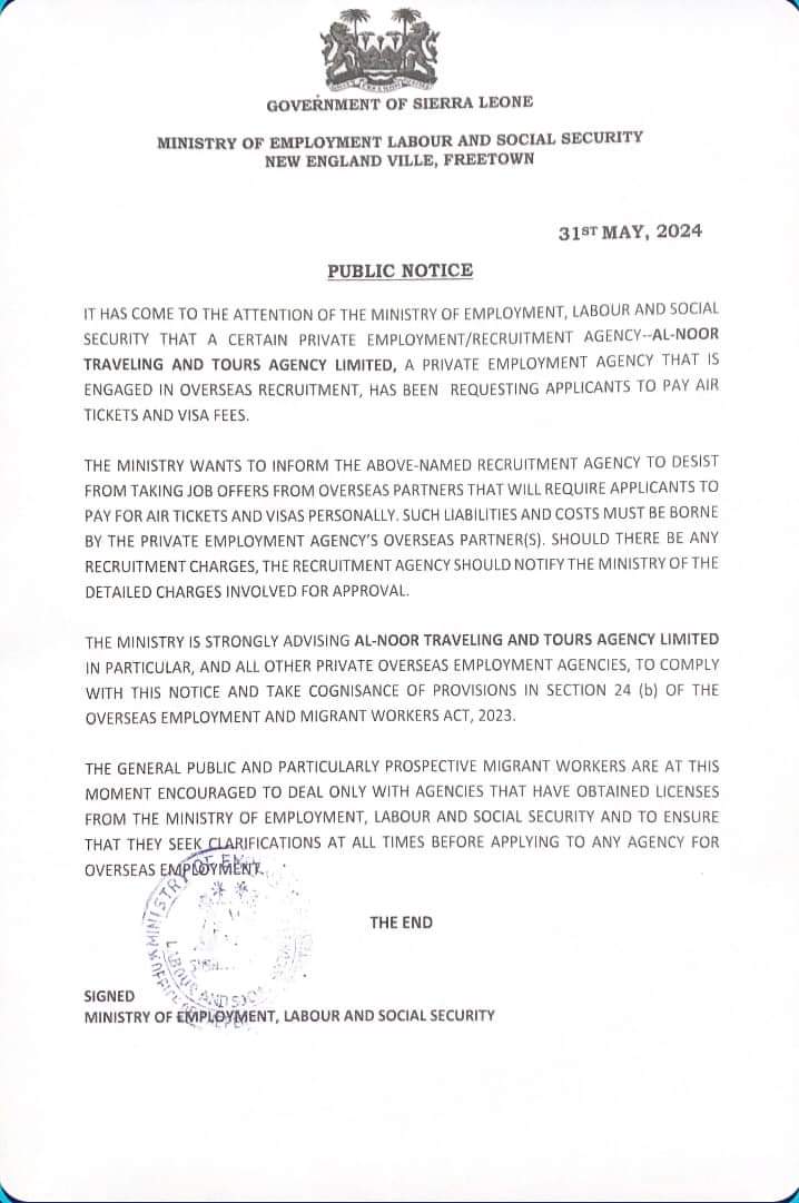 The Ministry of Labour, employment and Social Security has in a public notice dated 31st May, 2024 sent a stringent warning to a company called Al-Noor Travelling and Tour Agency Limited that is bent of demanding money from Sierra Leoneans on travelling to abroad to deviate from such illegal practices with immediate effect.