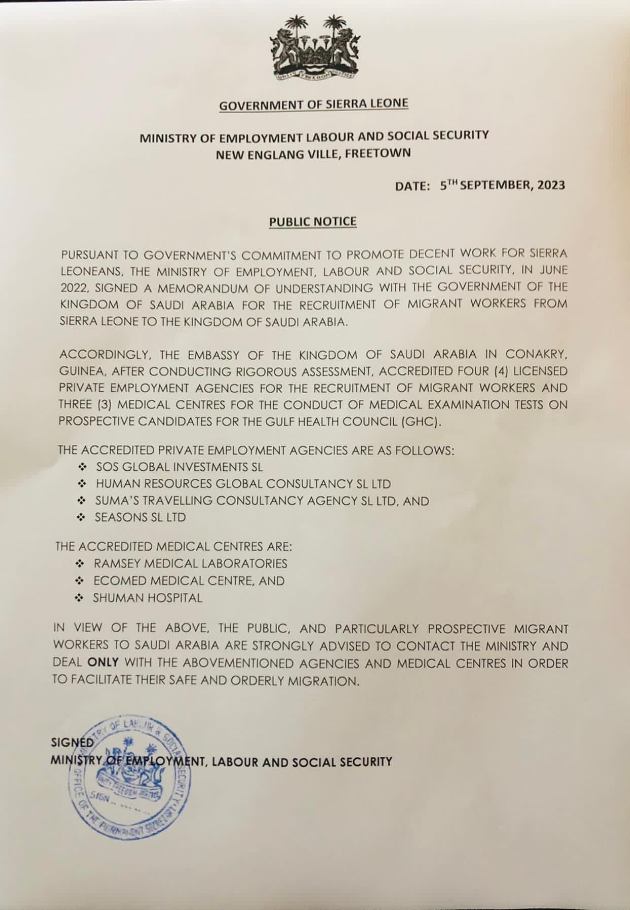 The Ministry stated that the warning is in tandem with the Government’s commitment to promote decent work for Sierra Leoneans. They stated that the Ministry of Employment, Labour and Social Security in June 2022 signed a memorandum of understanding with the Government of Saudi Arabia for the recruitment of migrant workers from Sierra Leone to the Kingdom of Saudi Arabia.