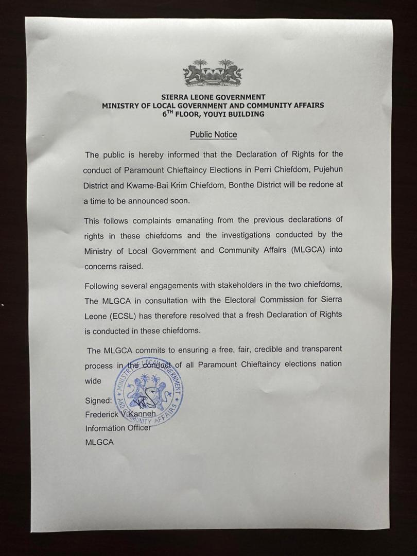 The Ministry of Local Government and Community Affairs is set to announce a new date for the Declaration of Rights for the conduct of Paramount Chieftaincy elections in Perri Chiefdom, Pujehun District and Kwame-Bai Krim Chiefdom, Bonthe District.