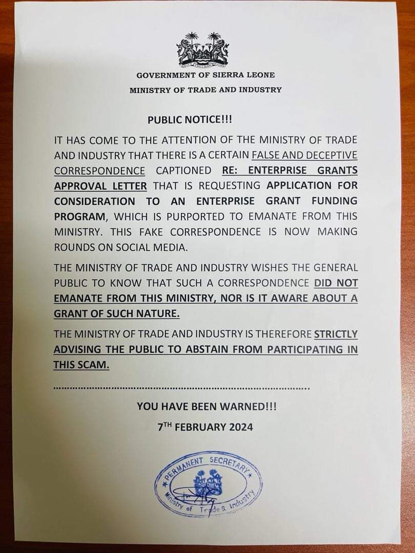 The Ministry of Trade and Industry issued a stern public notice alerting citizens to a fraudulent scheme circulating on social media platforms. The notice highlighted a deceptive correspondence under the caption “RE: Enterprise Grants Approval Letter,” falsely claiming affiliation with the Ministry and soliciting applications for an alleged enterprise grant funding program.