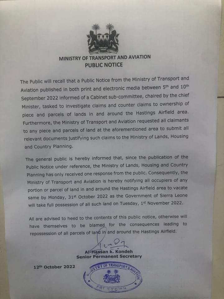 The Ministry of Transport and Aviation has issued an ultimatum, demanding for all illegal occupants of parcel or portions of land in and around the Hastings Airfield area to vacate the premises.