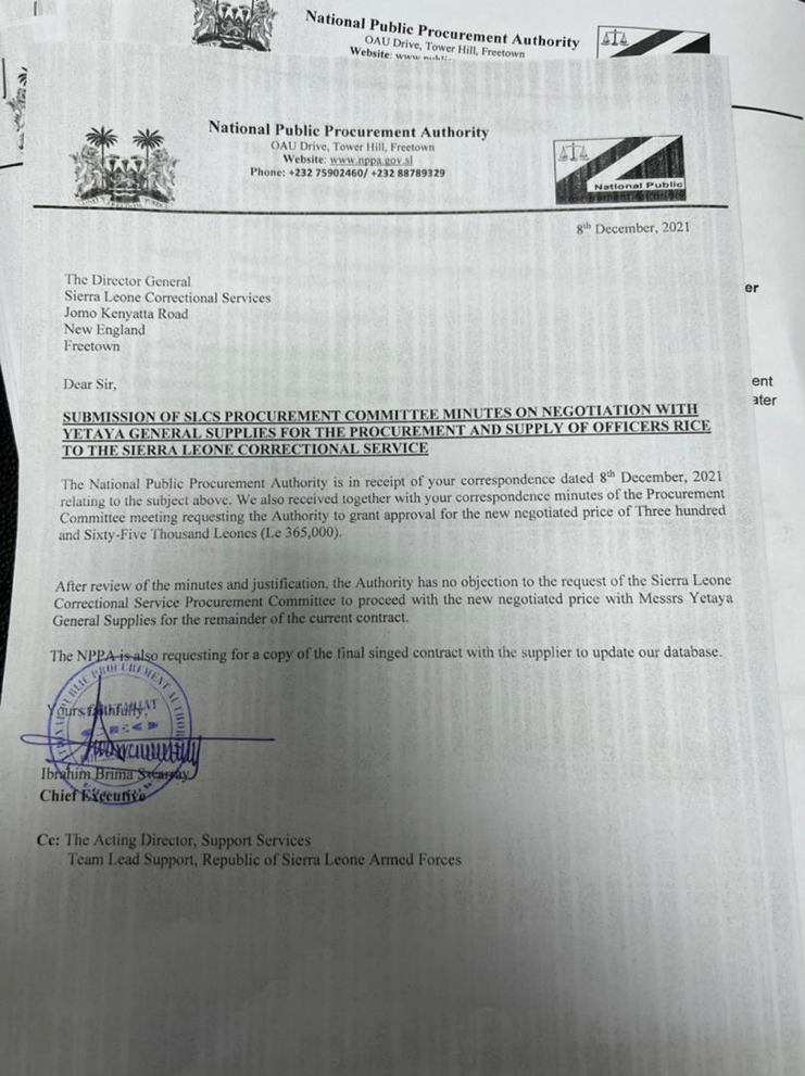 Contrary to reports that one of the bidders to the contract for the supply of rice and flour to inmates and officers of the Sierra Leone Correctional Service (SLCS), Yetaya General Supplies, it has been established that the aforementioned company did actually agree to supply rice to the SLCS at the cost of Le365,000 per bag while Misheal Construction and Services Ltd. actually breached the contract awarded it by the SLCS when it failed to supply rice to the SLCS for about three months which could have led to insecurity and a possible jail break or worse.
