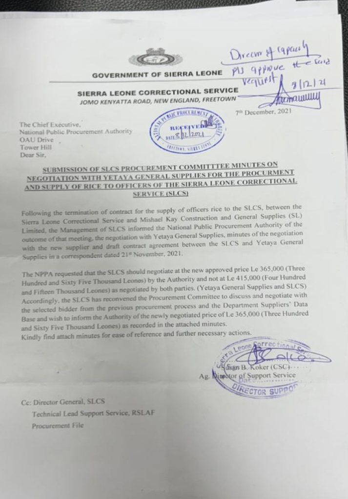 It should be recalled that a SLCS letter dated 23rd November, 2021 written to Misheal Kay Construction & Supplies Ltd., did state that, this is “Concomitant with a similar letter you (Misheal Kay Construction & Supplies Ltd.) are in receipt of for the non-supply or rice to officers of the Sierra Leone Correctional Service dated 17th November, 2021 for six months.” The letter reminded Misheal Kay Construction & Supplies Ltd. that: “you received payment of Le656,980,000 (six hundred, fifty-six million, nine hundred and eighty thousand Leones) in respect of officers’ rice which you never delivered.”