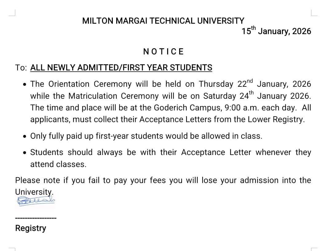The Milton Margai Technical University (MMTU) has announced the dates for its Orientation and Matriculation ceremonies for new students.