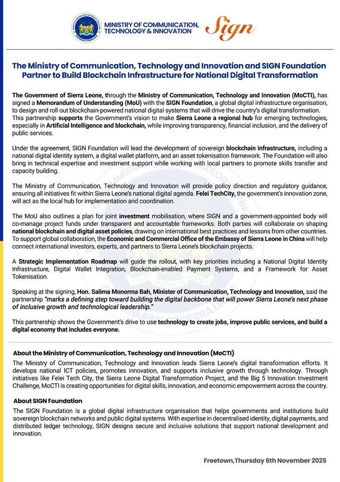 The Government of Sierra Leone, through the Ministry of Communication, Technology and Innovation (MoCTI), has signed a Memorandum of Understanding (MoU) with the SIGN Foundation a global digital infrastructure organisation to design and roll out blockchain-powered national digital systems aimed at advancing the country’s digital transformation.