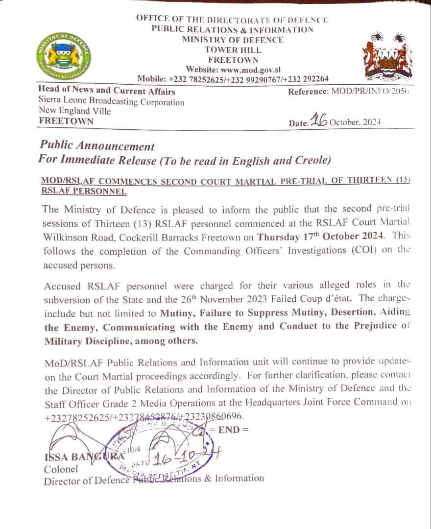 The Ministry of Defence (MOD) and the Republic of Sierra Leone Armed Forces (RSLAF) have begun the second phase of pre-trial sessions for thirteen RSLAF personnel, following their alleged involvement in the failed coup d’état of November 26, 2023.
