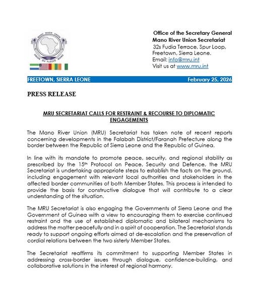 The Mano River Union (MRU) Secretariat has called for calm and diplomatic engagement following recent developments in the border area between Sierra Leone and Guinea.