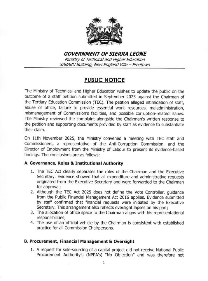 The Ministry of Technical and Higher Education (MTHE) has released its official findings following an investigation into a staff petition filed in September 2025 against the Chairman of the Tertiary Education Commission (TEC).