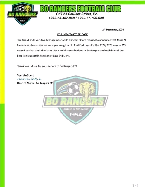 Bo Rangers football club has confirmed the transfer of Musa Noah Kamara (Tombo) on a year loan deal to Eastern Lion Football Club.
