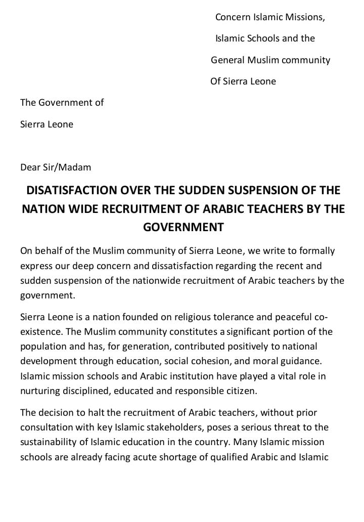 The Muslim community in Sierra Leone has expressed “deep concern and dissatisfaction” following the government’s sudden decision to suspend the nationwide recruitment of Arabic teachers.