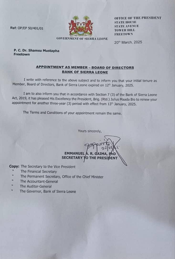 “I am to also inform you that in accordance with Section 7 (3) of the Bank of Sierra Leone Act, 2019, it has pleased His Excellency the President, Brig. (Rtd.) Julius Maada Bio to renew your appointment for another three-year (3) period with effect from 13th January, 2025,” stated the letter.