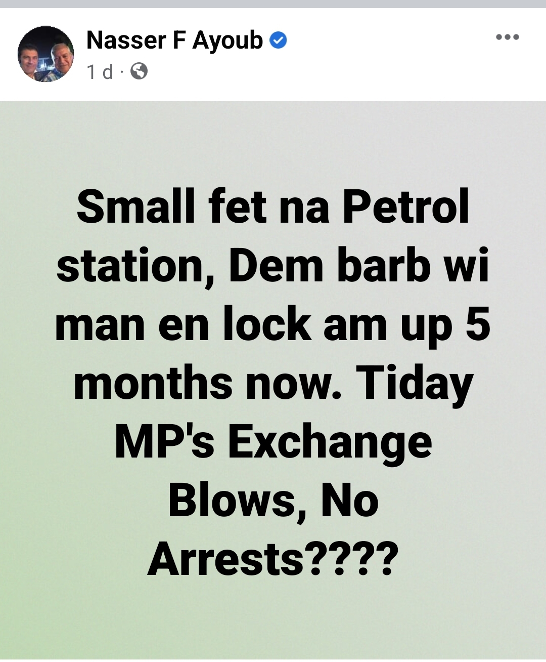 Small fet na Petrol station, Dem barb wi man en lock am up 5 months now. Today MP’s Exchange Blows, No Arrests???? Nasser Ayoub commented”