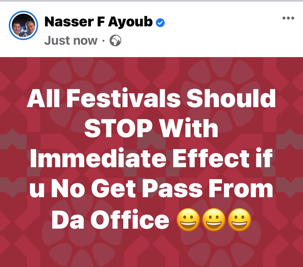 On another post few hours ago Nasser Ayoub hit Kao Denero for the second time say “All Festivals should STOP With Immediate Effect if U No Get Pass From Da Office.” This post was accompanied by laughter emojis which depicts Nasser’s emotions to the ambassador’s announcement.