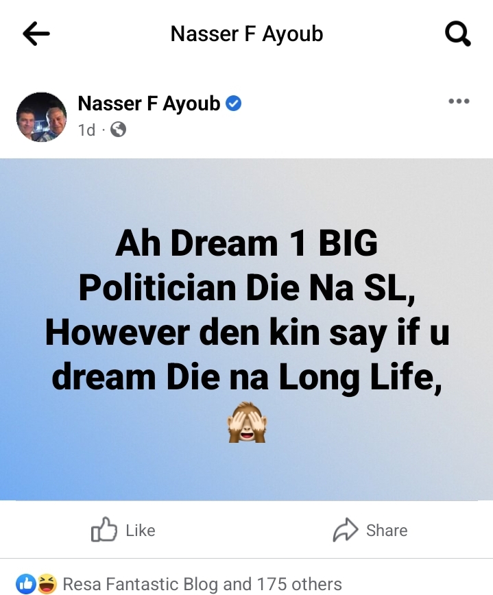 Sierra Leonean Artist and Entrepreneur, Nasser F Ayoub has shared a dream he had about one of the politicians in Sierra Leone.