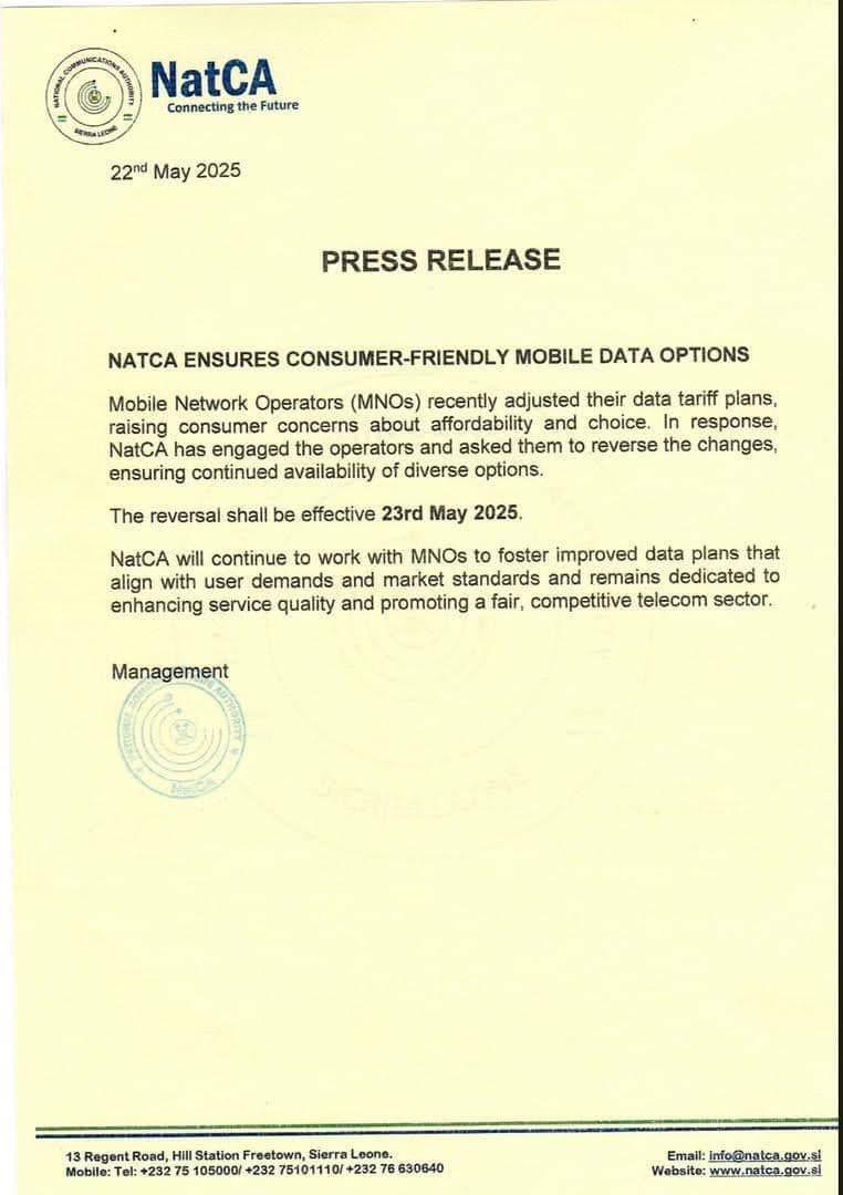 Mobile Network Operators (MNOs) in Sierra Leone will reverse recent adjustments to their data tariff plans, effective Friday, May 23, 2025.
