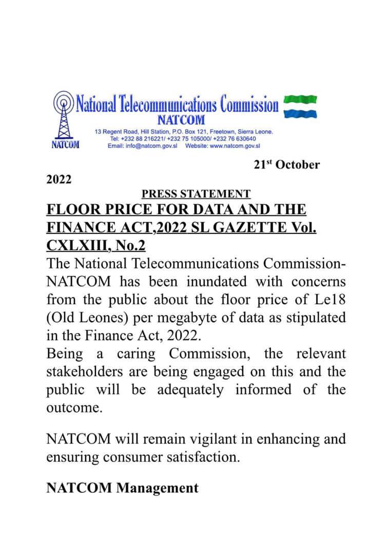 “The National Telecommunications Commission NATCOM has been inundated with concerns from the public about the floor price of Le18 (Old Leones) per megabyte of data as stipulated in the Finance Act, 2022.