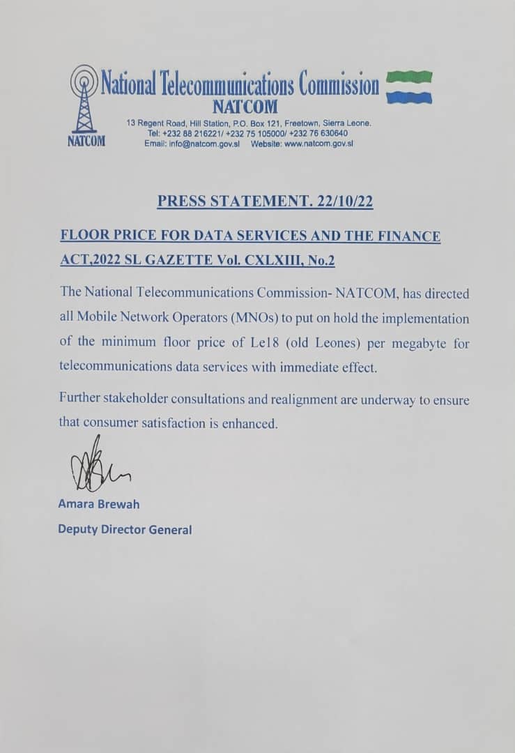 The Regulatory body of Telecommunication in Sierra Leone NATCOM has ordered the suspension of the implementation of the new floor price of Le 18 for megabytes with immediate effect.