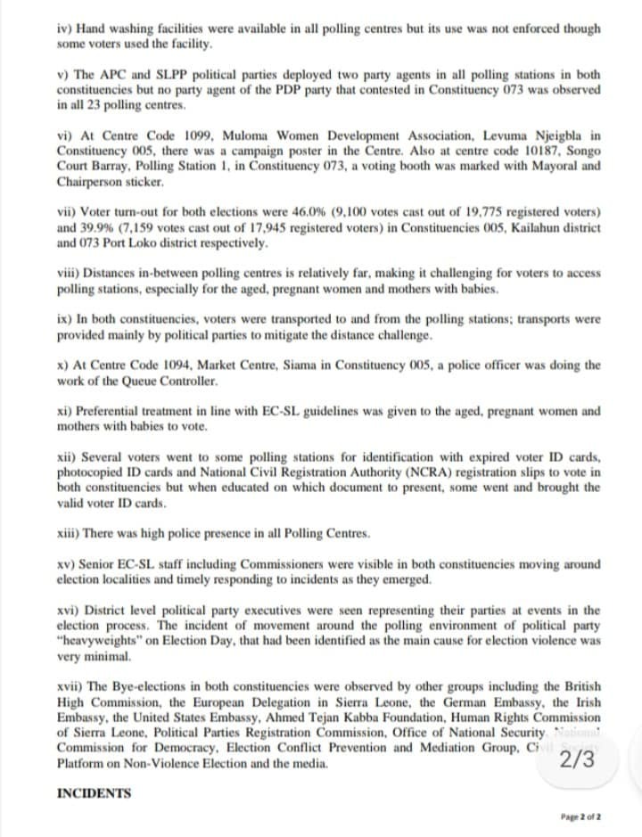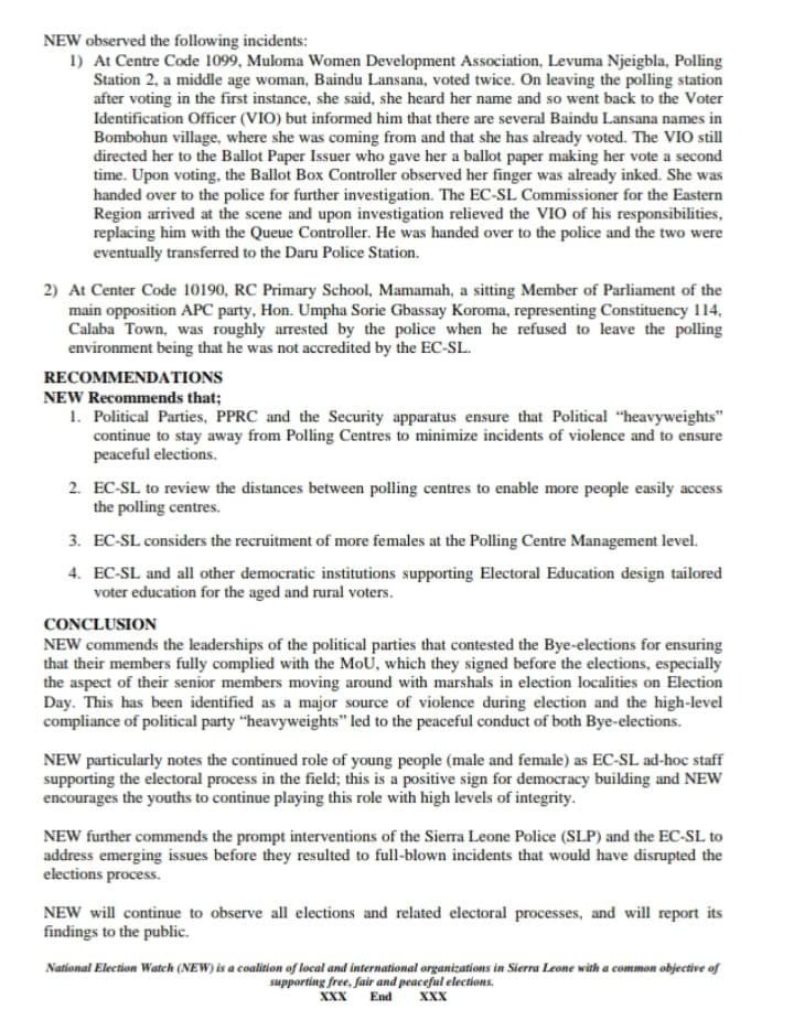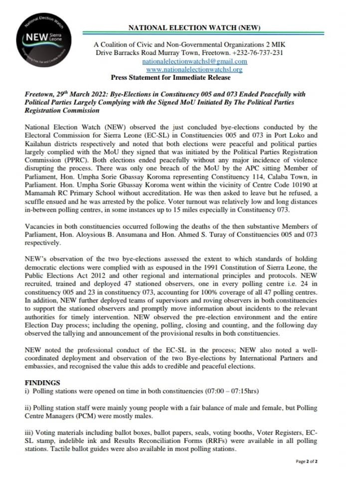 The National Election Watch (NEW) has released their observed reportson the just concluded by-elections conducted by the Electoral Commission for Sierra Leone (ECSL) in Constituencies 005 and 073 in Kailahun and Port Loko respectively.