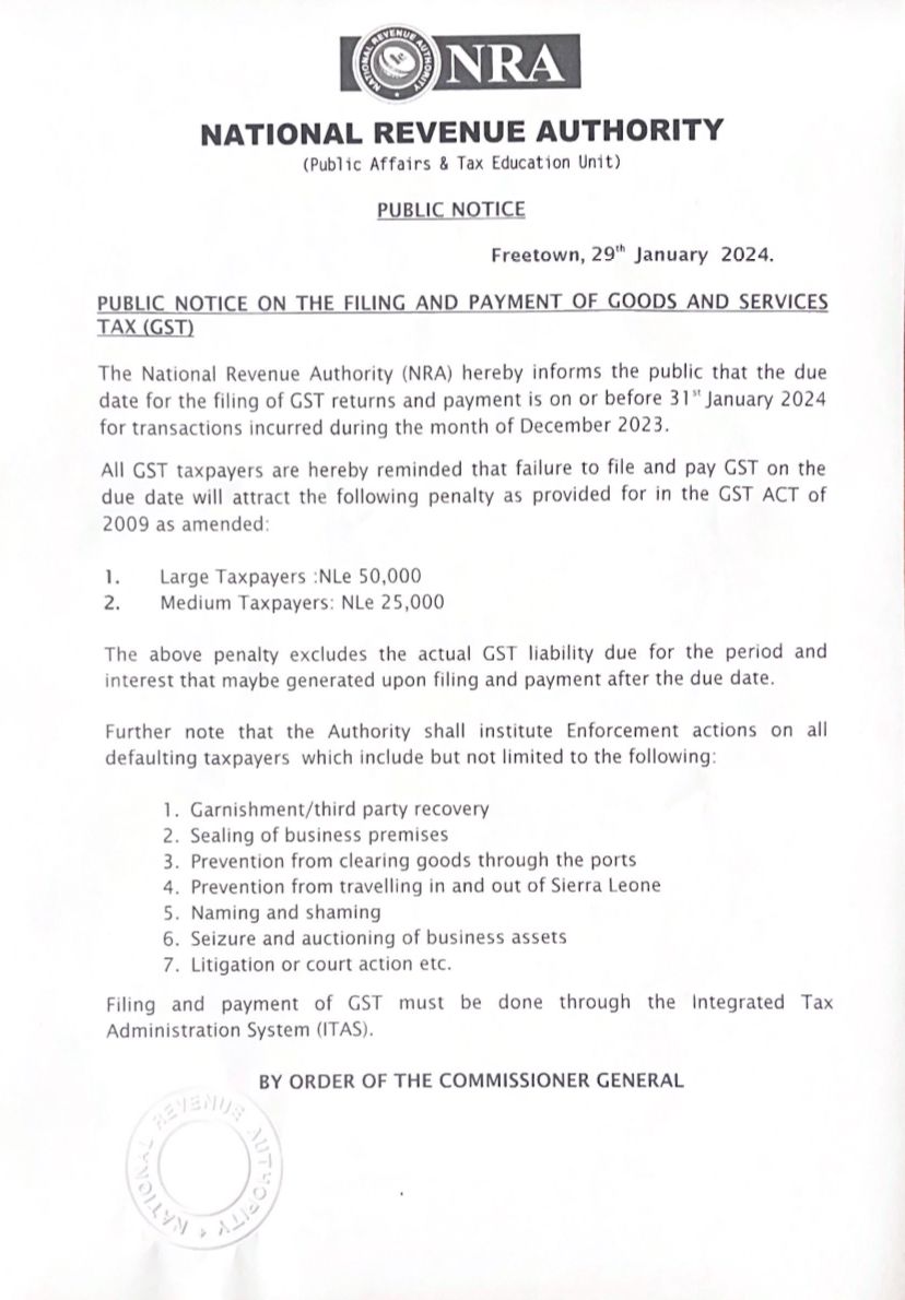 In a public notice issued on Monday, January 29, 2024, the National Revenue Authority (NRA) has informed the public about the approaching deadline for filing Goods and Services Tax (GST) returns and making payments. The due date for these transactions, related to the month of December 2023, is set on or before January 31, 2024.