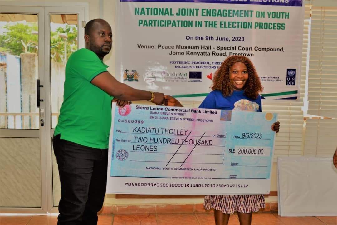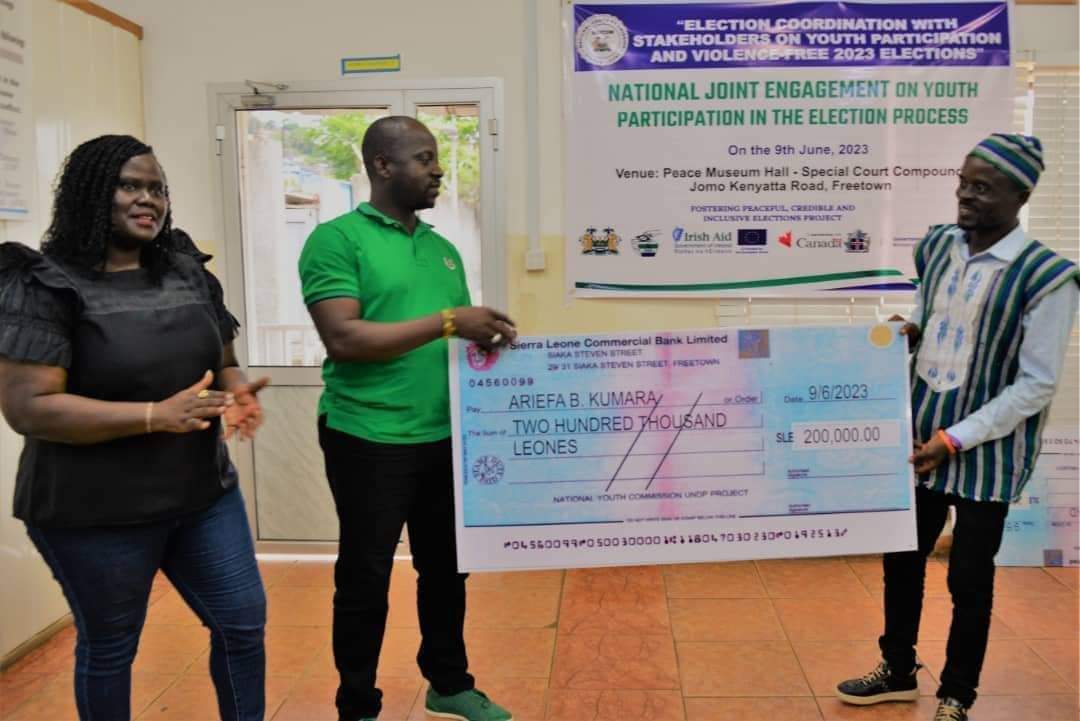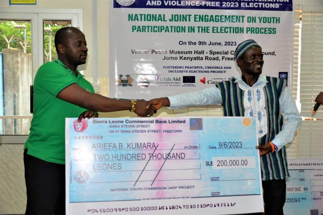 In a significant effort to promote peaceful, credible, and inclusive elections on June 24, 2023, the National Youth Commission of Sierra Leone (NAYCOM), with support from international partners, has awarded two hundred thousand new Leones (NLe. 200,000.00) financial support to five regional youth group leaders.