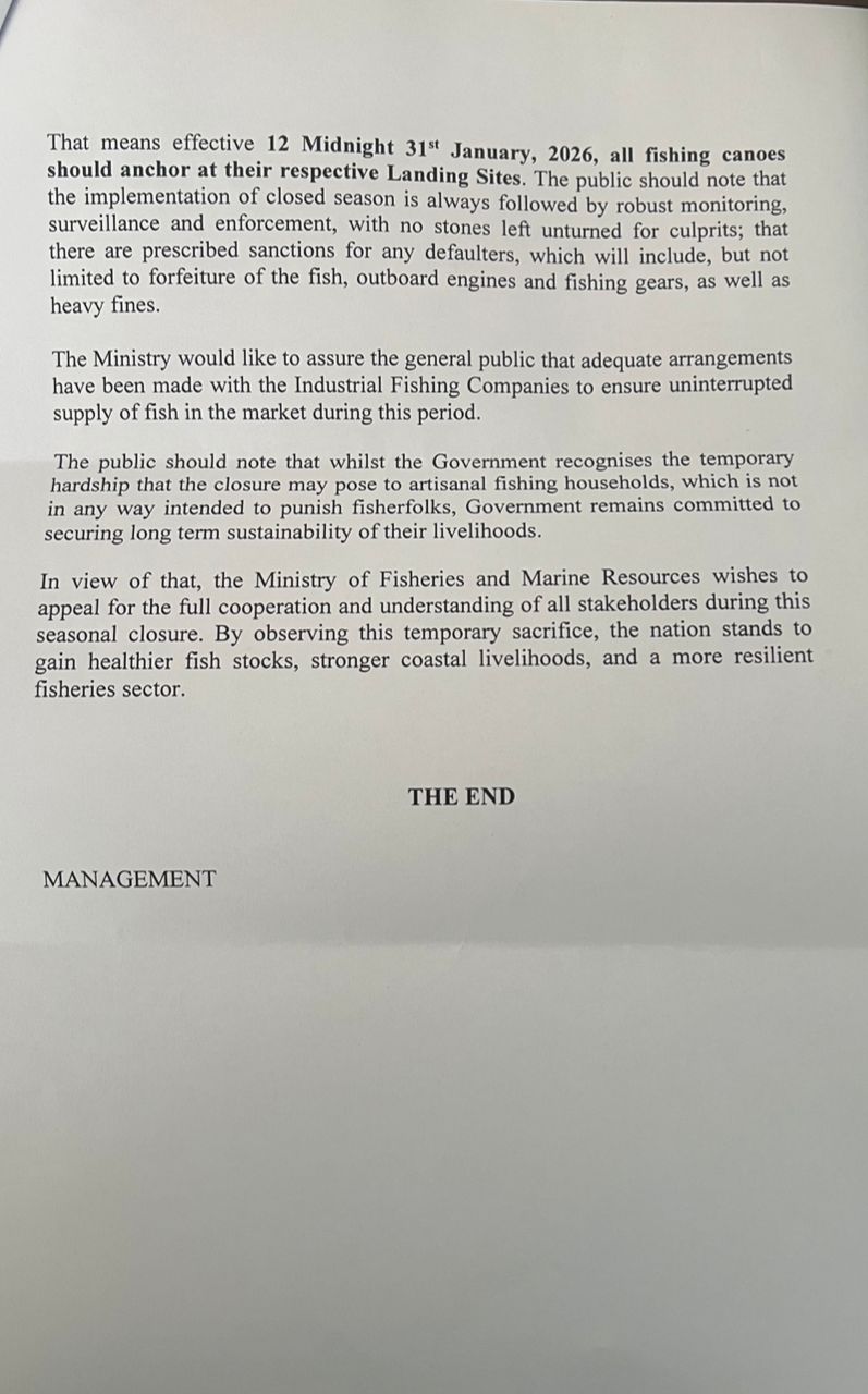 The Ministry of Fisheries and Marine Resources has declared a closed fishing season for all artisanal fishers from February 1 to 28, 2026, marking a significant expansion of the country’s sustainability policy.