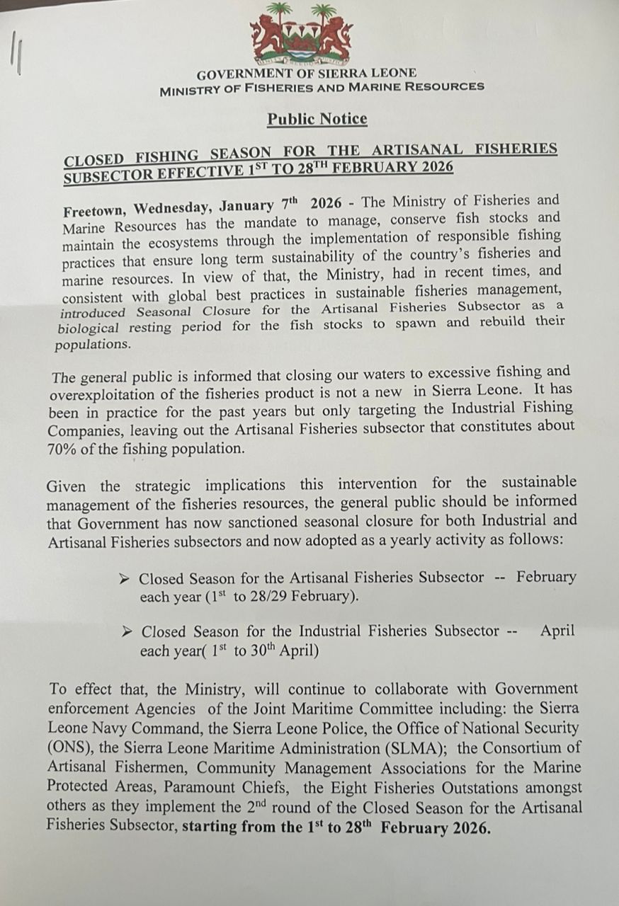 Historically, seasonal closures applied only to industrial fishing companies. This new measure now includes the artisanal subsector, which represents approximately 70% of Sierra Leone’s fishing population. A separate closure for the industrial sector will take place from April 1 to 30.