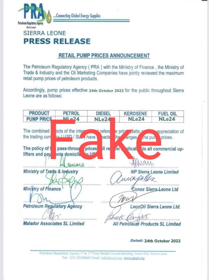 “The release making the rounds that the pump price of fuel has been increased to Le 24 is fake, malicious, dangerous and a contagious wishful thinking by some unpatriotic Sierra Leoneans to create chaos,” the Consortium stated.