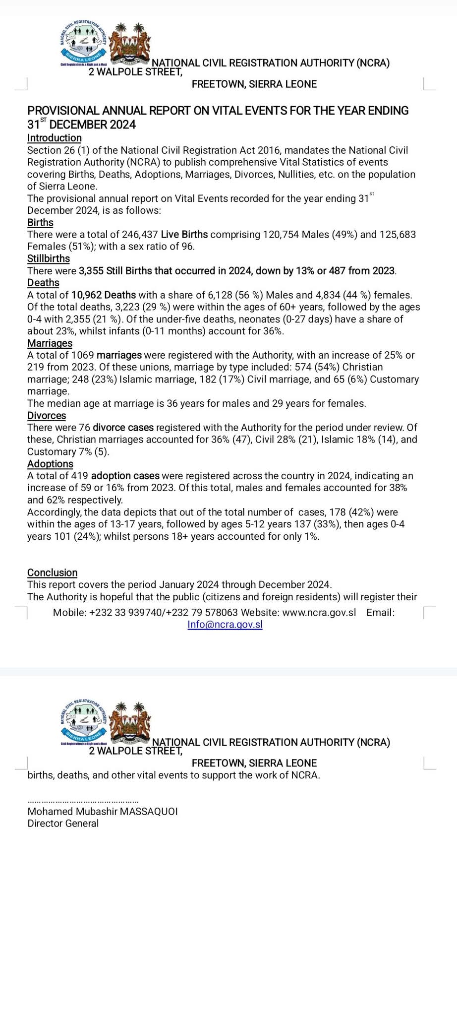 The National Civil Registration Authority (NCRA) has released its provisional annual report on vital events for the year ending December 31, 2024.