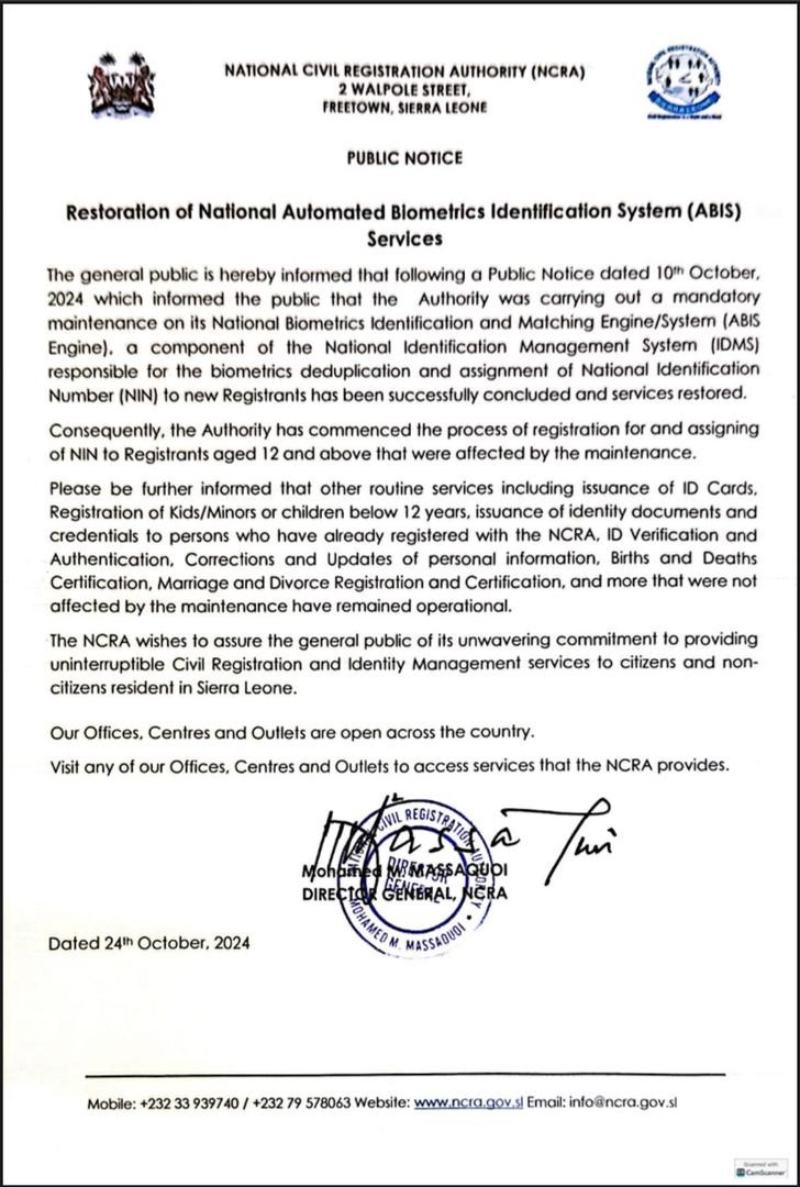 The National Civil Registration Authority in a press release dated 24th October, 2024 informing the public of the Restoration of National Automated Biometrics Identification System (ABIS) Services is now available.